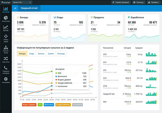 Всегда используем Google Analytics, Яндекс Метрика, коллтрекинг,