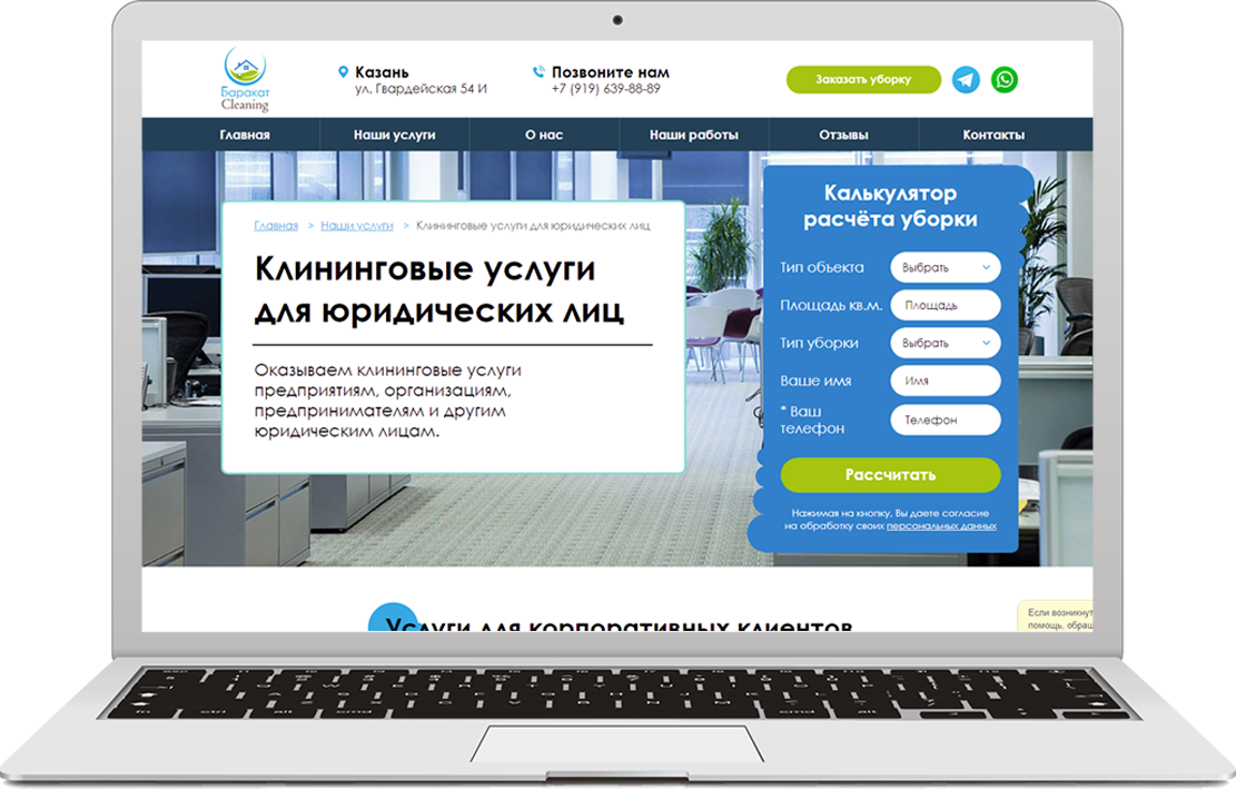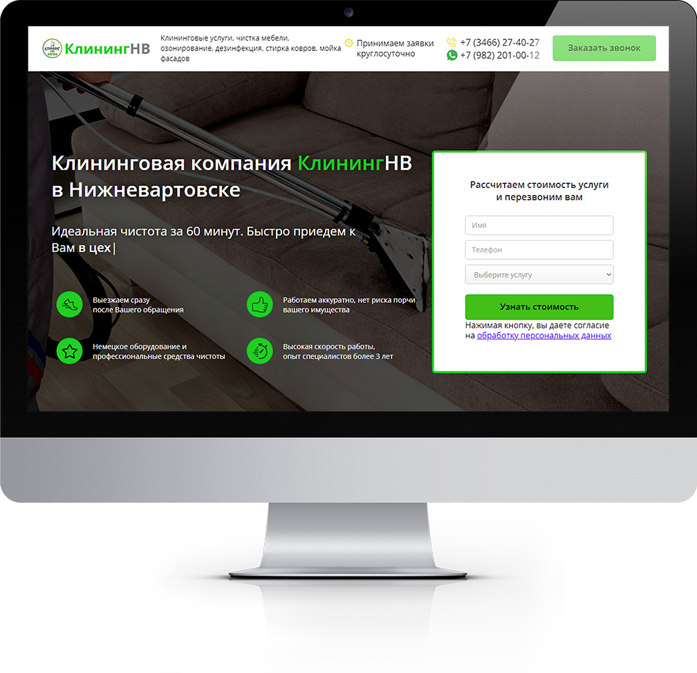 Разработка продающего сайта, настройка и ведение контекстной рекламы для молодой клининговой компании из г. Нижневартовск.
